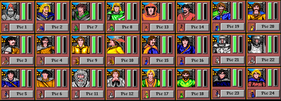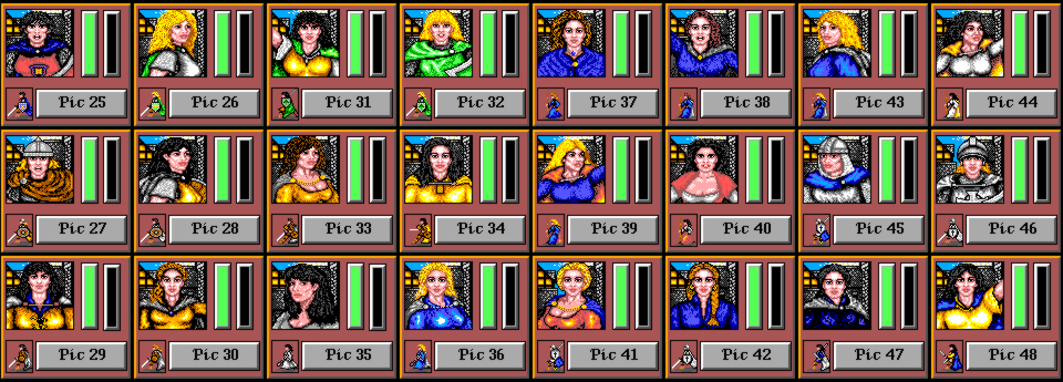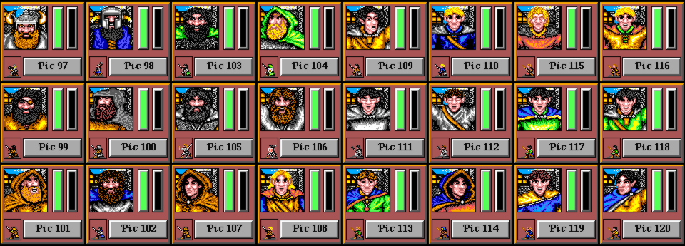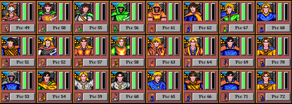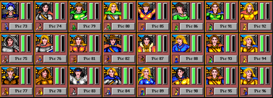 Volti-115 has kindly provided a compilation of all of the player character portraits in the game. Each portrait's number can be used to select it in my character editor.